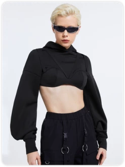 Kollyy Punk Black Cold Shoulder Hooded Metal Halloween Top Hoodie & Sweatshirt