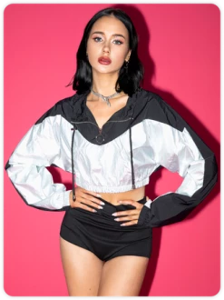 Kollyy Street Black Color Block Drawstring Zip Up Top Hoodie & Sweatshirt