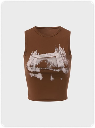 Kollyy Street Brown Landscape Print Top Tank Top & Cami